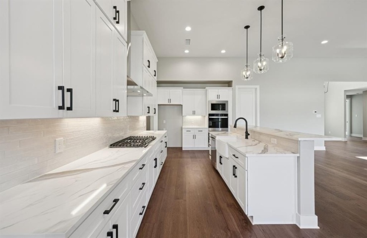 High ceilings and designer finishes create a light-filled, airy atmosphere throughout. The kitchen showcases soaring custom cabinetry, marble countertops, and an oversized island that flows seamlessly into the vaulted dining room and living area. Natural wood built-ins anchor the living room’s entertainment space, while triple sliding glass doors connect the indoors to a covered patio prepped with gas, plumbing, and electrical for a future outdoor kitchen.