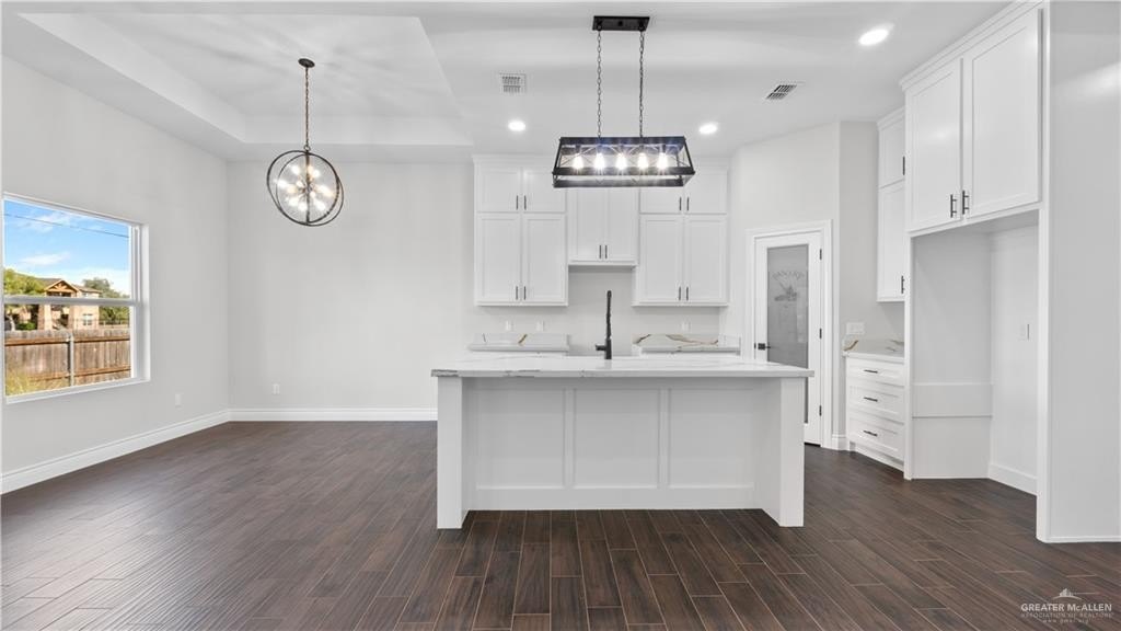 The kitchen includes quartz countertops, custom cabinetry, a walk-in pantry, and a large center island ideal for meal preparation and entertaining.