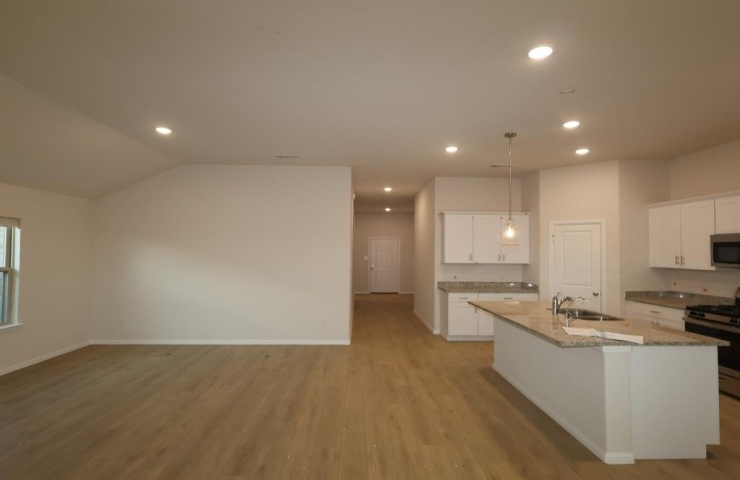 The well-planned floorplan emphasizes comfort and practicality. The owner’s suite nestled at the back of the home provides privacy and ease of access, while the additional bedrooms offer flexibility for family, guests, or a home office. The open-concept layout creates a bright, inviting environment for daily life and entertaining. The kitchen is a standout space with an abundance of white painted cabinetry, stainless steel appliances, and granite countertops.