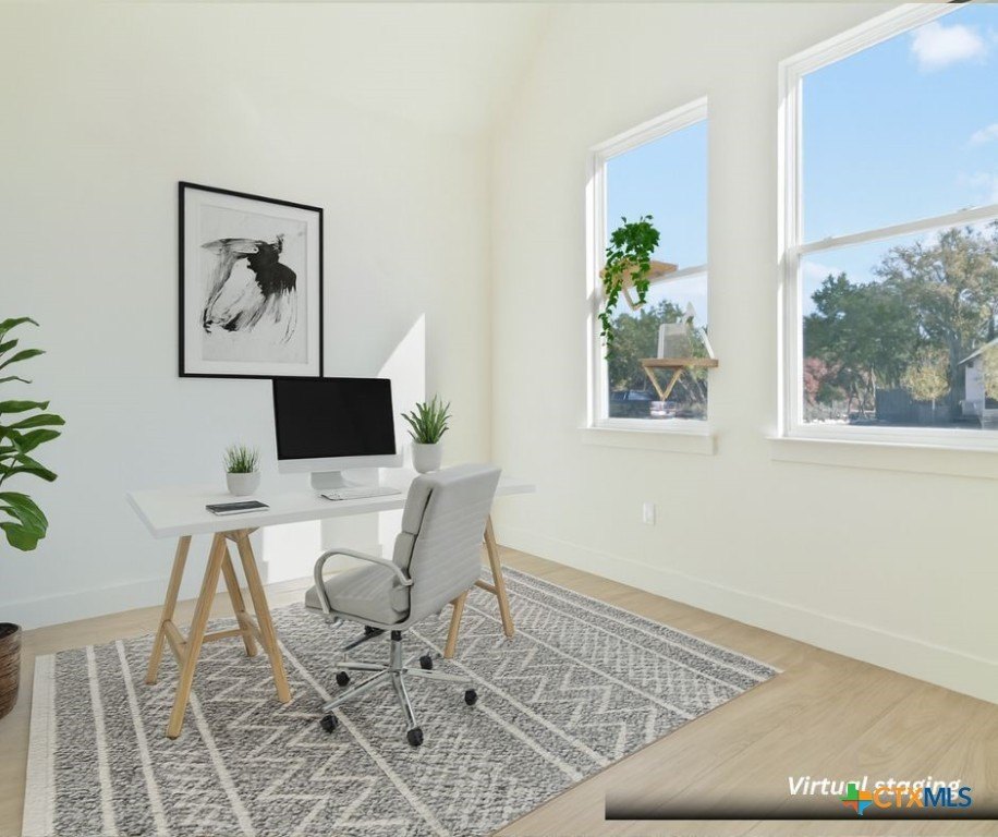 Property Description: Exceptional lot. Finished construction. Compelling value-this modern farmhouse sits on an oversized 0.275-acre cul-de-sac street lot surrounded by mature oak trees. With a little over 2,000 sqft, you have 3 bedrooms, 2.5 baths, and a dedicated office with cathedral ceilings-a rare find at this price point. Striking curb appeal features an elevated roofline, stone-accented exterior, and covered front porch. Inside, the open-concept layout delivers clean, modern finishes with leathered granite countertops, soft pine cabinetry, and a statement chandelier anchoring the dining space. The main-level primary suite includes dual vanities, a frameless walk-in shower with bench and custom tile, private water closet, and a walk-in closet with custom shelving. Upstairs, two spacious secondary bedrooms are privately positioned with a full bath between them. Enjoy Hill Country living from the deep covered back patio overlooking a level yard with views of mature oaks. Added functionality includes a garage side door for easy yard access and a water softener loop. Located in Wimberley, with quick access to San Marcos, Dripping Springs, Canyon Lake, and Austin-approximately 25 minutes away. Close-out inventory. Exceptional lot. Reduced price. Schedule your private showing today.