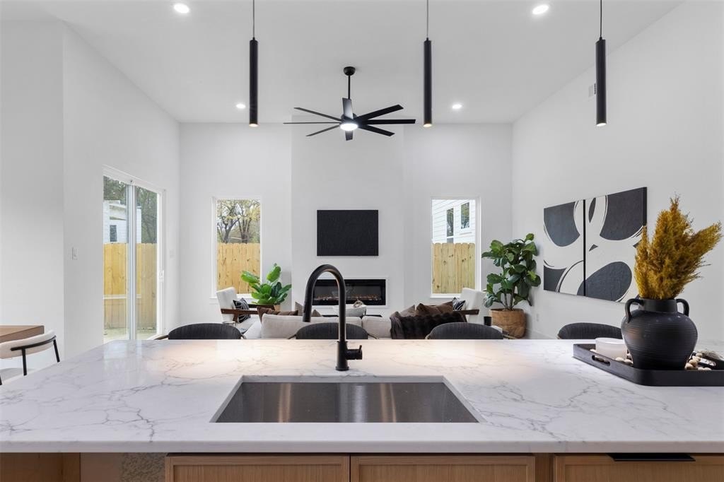 Step inside through the 10-ft Pella front door and be greeted by an open-concept layout featuring luxury vinyl plank flooring and energy-efficient LED lighting. The heart of this home is the stunning 12-foot ceiling kitchen, featuring a 10-foot island with bar seating—perfect for entertaining and casual dining. Sleek cabinetry spans over 15 feet, offering abundant storage and counter space. The open layout flows seamlessly into the living and dining areas, creating an airy and inviting space ideal for gatherings. Designer finishes with modern lighting.