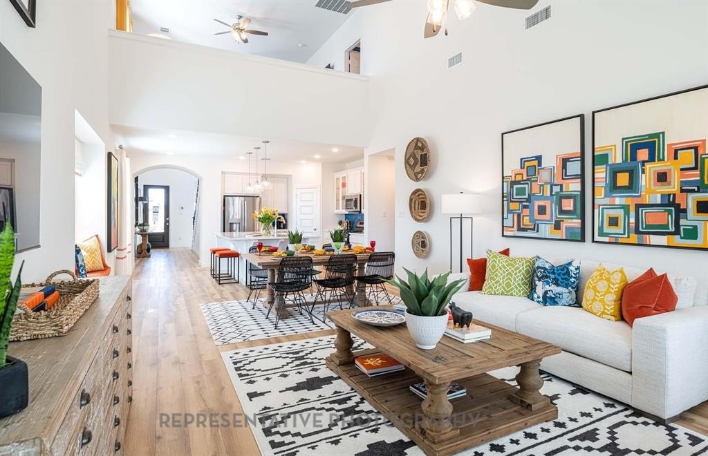 Thoughtfully crafted,the layout includes an extended outdoor living area,perfect for relaxing or entertaining. The primary suite elevates everyday living with a drop-in soaking tub and a separate walk-in shower. Inside,you’ll find plush carpeting,luxury vinyl plank flooring,and pre-finished cabinets,all complemented by sleek quartz countertops and an open staircase railing that adds a sophisticated touch.