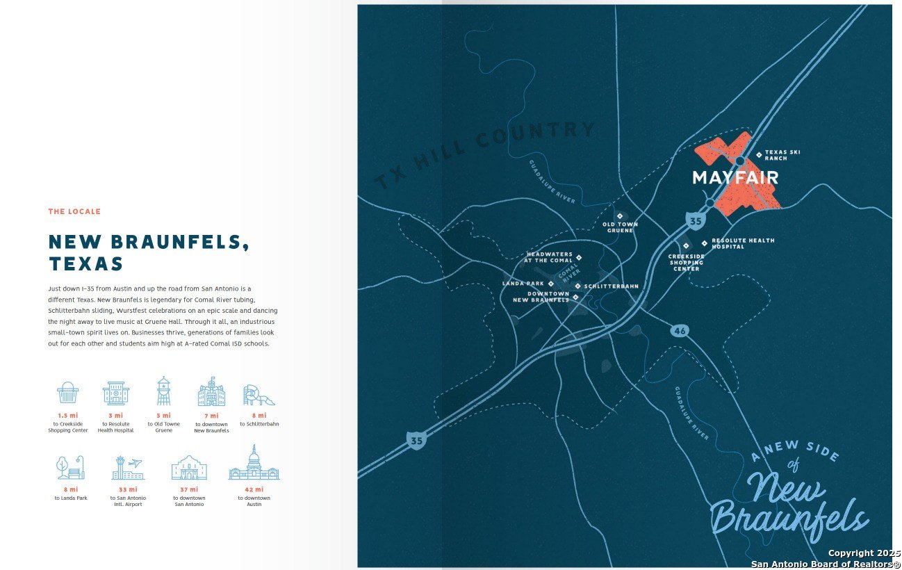 Property Description: Introducing the Hideaway - a sophisticated and thoughtfully crafted one-story residence nestled in the beautiful Mayfair community of New Braunfels. Open-concept layout flows effortlessly from the gourmet kitchen into the dining and living areas, creating an inviting hub perfect for gatherings and everyday living. The oversized master suite offers a luxurious retreat, complete with a spa-inspired bathroom and generous walk-in closet.