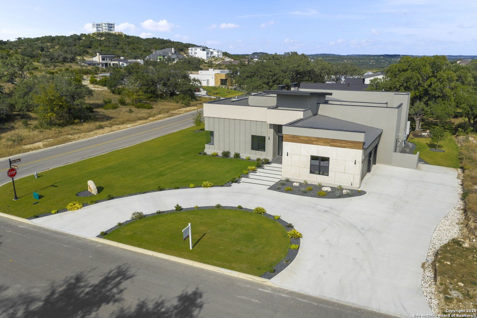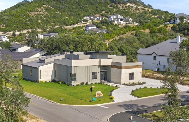 Property Description: A statement of modern architecture and refined Hill Country living, this custom single-story residence in The Canyons at Scenic Loop is constructed with 2x6 exterior framing, enhanced insulation, and single-slope standing seam metal roofing for superior efficiency, longevity, and clean contemporary lines. Offering 3,719 sq. ft. of intentional design, the home features gallery-height ceilings, expansive walls of glass, and seamless indoor-outdoor connection. The open living space is anchored by a striking feature wall with a linear fireplace, flowing into a chef's kitchen with European-inspired cabinetry, a waterfall black granite island, 48" professional gas range with pot-filler, double ovens, and a hidden walk-in pantry. The owner's retreat evokes a spa-like sanctuary with a sculptural soaking tub, oversized glass shower, and warm natural textures. Outdoor living becomes an everyday experience with a resort-style pool and elevated spa framed by water and fire features, covered lounge terrace with fireplace, outdoor kitchen, and poolside shower beneath heritage oaks-where minimalist design and luxury craftsmanship meet at the highest level.