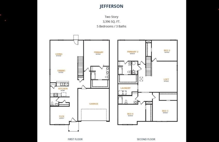 Property Description: MLS# 21131341 - Built by NHC - May 2026 completion! ~ The Jefferson Plan from our Liberty Series redefines spacious living, offering a layout designed for ultimate comfort and convenience. This 2-story home features 5 bedrooms, 3 bathrooms, a 2-car garage, and a generous 3,396 square feet of living space. This unique plan includes two primary bedrooms, each with a private bathroom — one conveniently located on the main level and the other on the upper level, offering flexible living options for multigenerational families or hosting long-term guests. As you enter, you’ll pass a versatile flex room and a half bathroom before arriving at the open-concept kitchen. The kitchen, complete with a central island, seamlessly overlooks the dining area and spacious family room, making it the heart of the home. Stairs located in the family room lead to the upper level, where you’ll find three additional bedrooms, one full bathroom, a huge loft for additional living or entertaining space, and a conveniently located laundry room.