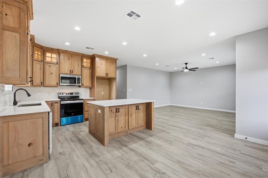 Property Description: Welcome to this beautiful new construction 3-bedroom, 2-bathroom home offering 1,489 sq ft of living space, perfectly situated on a corner lot and conveniently located near grocery stores and fast-food options. Enjoy freshly sodded grass, a newly poured driveway, and a welcoming covered front porch with sleek black railing. Inside, you’ll find vinyl wood flooring throughout and recessed lighting in the open living areas, creating a bright and modern feel. The kitchen features quartz countertops, a crisp white backsplash, custom wood cabinetry, and a spacious island with barstool seating and additional storage, plus stainless steel range, microwave, and dishwasher that convey. The primary suite offers a spacious walk-in closet and a stylish bathroom with quartz countertops, ample storage, and a marble tub shower combo. Guest bedrooms are served by a secondary bathroom with quartz countertops, a marble tub shower combo and a large mirror. Toward the back of the home, you’ll find a dedicated laundry room with shelving, while the hallway includes a built-in work desk with a quartz countertop—perfect for a home office or study space. Step outside to the backyard and relax on the covered patio with black railing. Foam insulation adds energy efficiency, making this home as practical as it is stunning—don’t miss this move-in-ready gem!