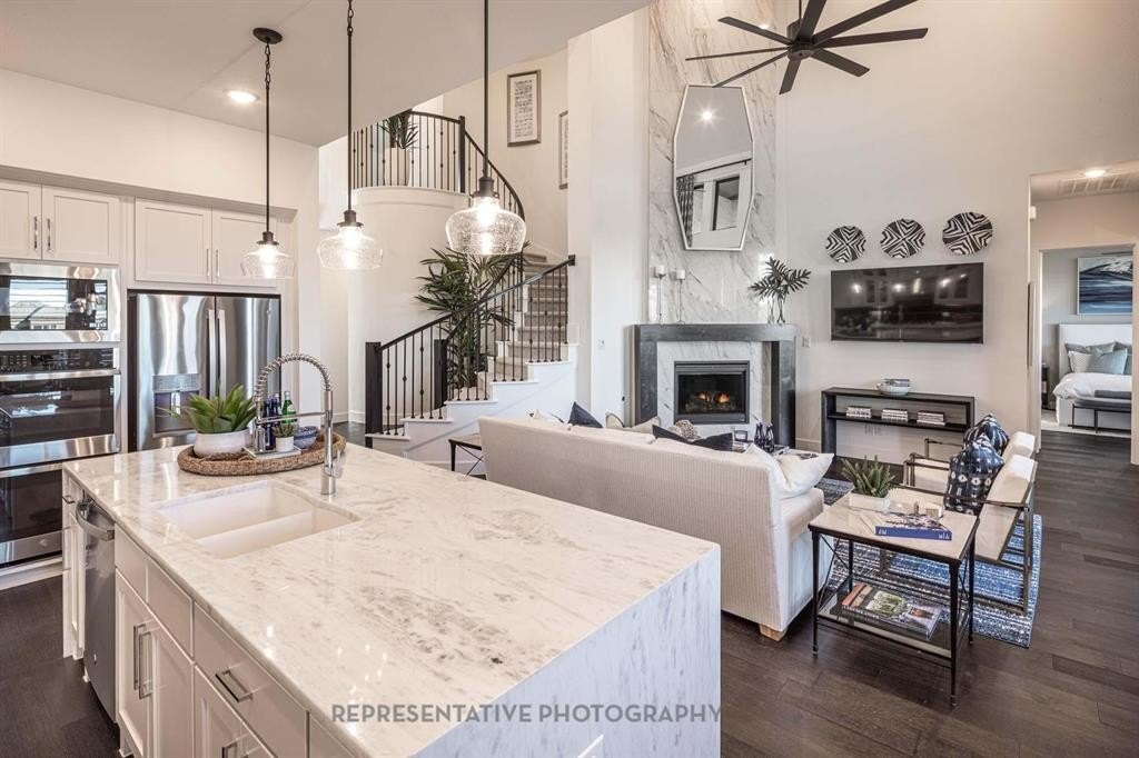 The extended primary suite offers a relaxing retreat with a spa-inspired bath highlighted by a 67in freestanding rectangular soaking tub. The open-concept family room includes a cozy fireplace, creating a warm and inviting atmosphere for everyday living and entertaining.