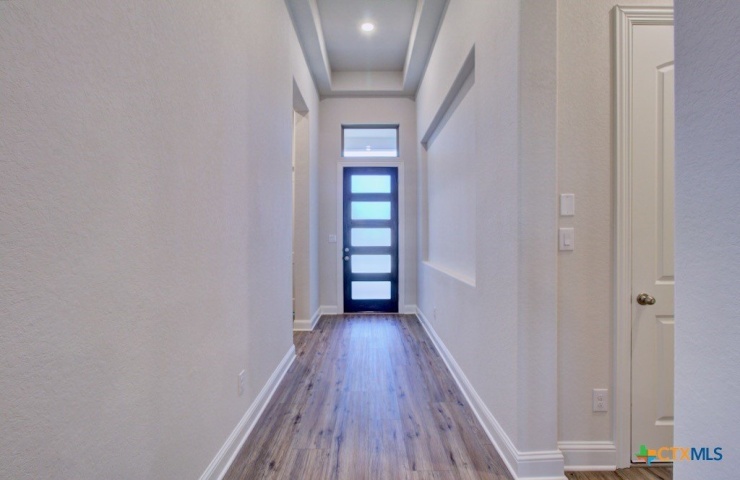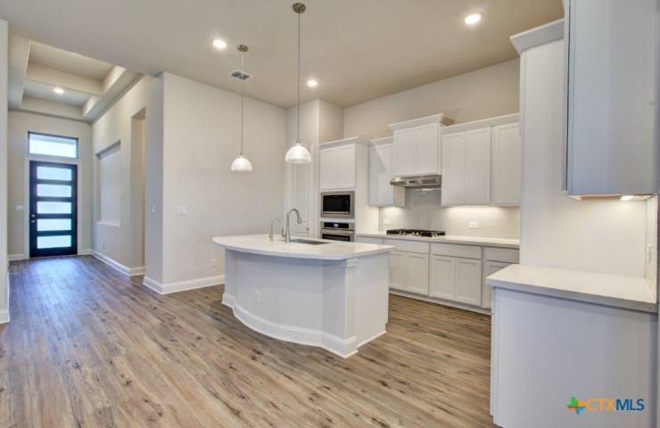 Property Description: Welcome to the Mahogany plan by DRB Homes at Veramendi. This single story home offers three bedrooms and two bathrooms with a practical layout designed for everyday living. The exterior includes a professionally landscaped yard, a covered patio, a six foot privacy fence, shrubs, and a full yard sprinkler system to help keep everything looking its best. Inside, the upgraded kitchen layout features omegastone countertops, a ceramic tile backsplash, a large island, and 42 inch wood cabinetry with crown molding. Cooking is made easier with a gas cooktop, built in oven, and microwave. The kitchen flows into the main living area, creating a comfortable space for dining and gathering. The owners suite includes an enlarged shower with tile surround and a clear glass door. The bath offers a marble composite vanity with two sinks, tall mirrors, chrome fixtures, and a spacious closet with an additional third closet bar for extra storage. Veramendi is a thoughtfully designed community featuring a resort style pool, open green areas, parks, and playgrounds. Planned future amenities include a two tiered pool, indoor gathering spaces, pickle ball courts, and sports courts, giving residents even more ways to enjoy time close to home.