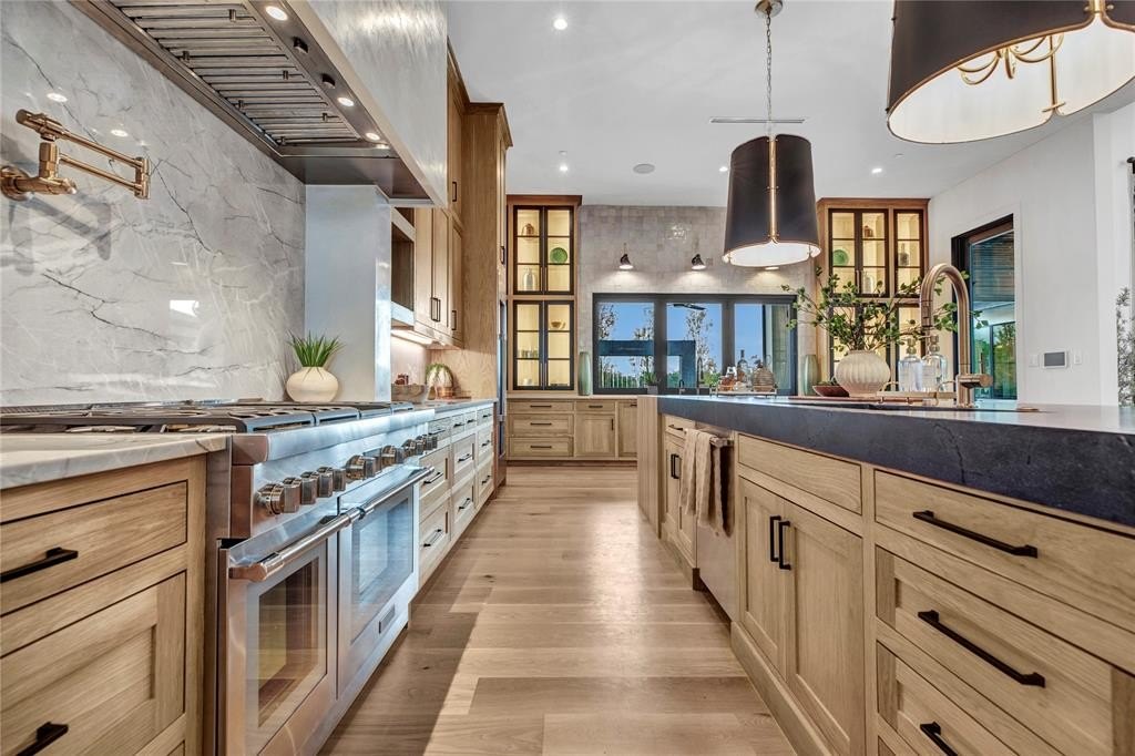 The open-concept kitchen is designed for both form and function, with premium appliances, an additional prep kitchen, and an extended walk-in pantry. Floor-to-ceiling windows in the main living area provide stunning views of the resort-style pool and outdoor entertaining space. The formal dining room features white oak flooring and a striking backlit wine wall, while a soaring 20-foot foyer with black-trimmed glass doors makes a bold first impression.