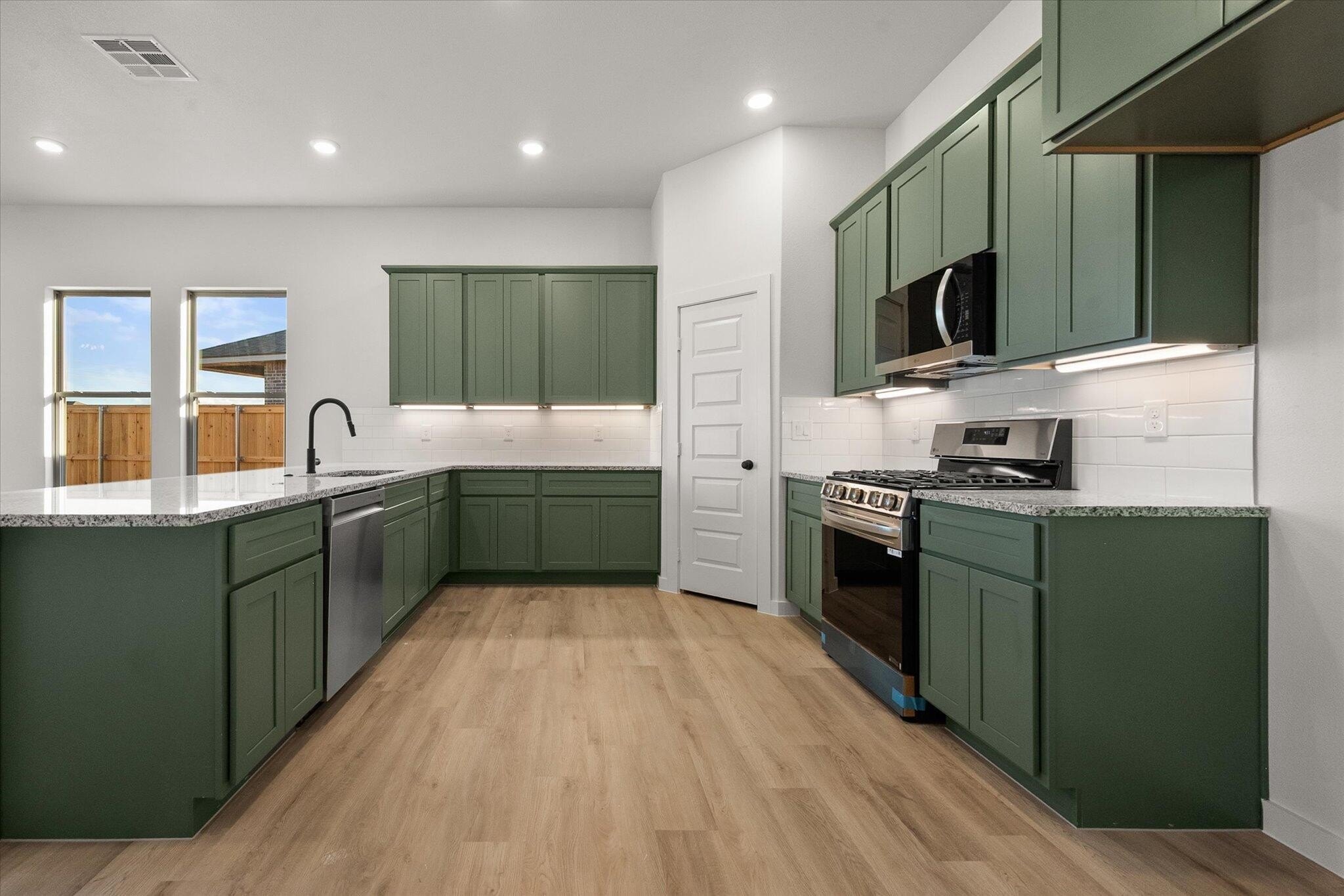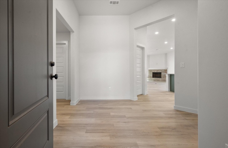 Property Description: Buy NOW and get up to $10,000 Use-It-Your-Way Cash! This beautiful home features a brick exterior with double columns and stone accents framing the covered front porch. Inside, luxury vinyl plank flooring flows through the open-concept kitchen, living, and dining areas. The kitchen includes granite or quartz countertops, a spacious peninsula with bar seating, stainless steel appliances, and a large enclosed pantry. The cozy living room boasts a corner brick fireplace. The secluded master suite offers a drop-in tub, walk-in shower, his and hers vanities, and a walk-in closet with utility room access. Enjoy the outdoors on the covered back patio. Premium fixtures complete this elegant home.