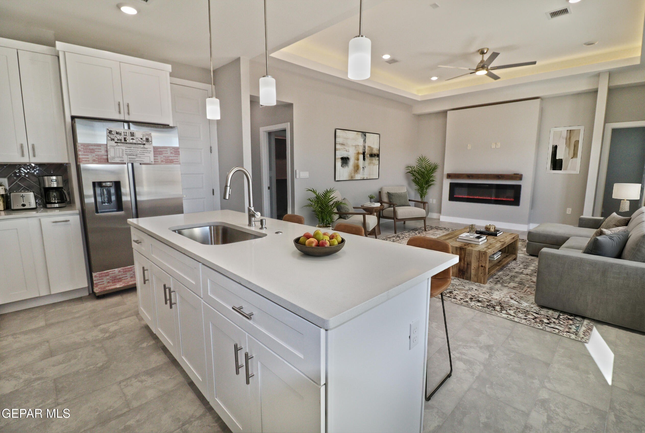 Property Description: Welcome to this beautifully designed, brand-new, move-in-ready one-story home, featuring timeless color palettes and modern finishes throughout. The open-concept layout creates a seamless flow between the kitchen, dining, and living areas-ideal for both everyday living and entertaining. The kitchen is a true centerpiece, showcasing a quartz island and countertops along with stainless steel appliances. The living area features a modern fireplace and as Builder incentive includes a mounted 75 in. flat-screen TV. adding both style and convenience. French doors provide abundant natural light and direct access to the backyard, enhancing the indoor-outdoor living experience. This home offers 3 bedrooms and 2.5 bathrooms, with the half bath conveniently located-perfect for guests. Ideally situated just 5 minutes from IDEA School and close to Fort Bliss. Builder offering up to 3% toward buyer's closing costs PLUS an allowance toward backyard landscaping