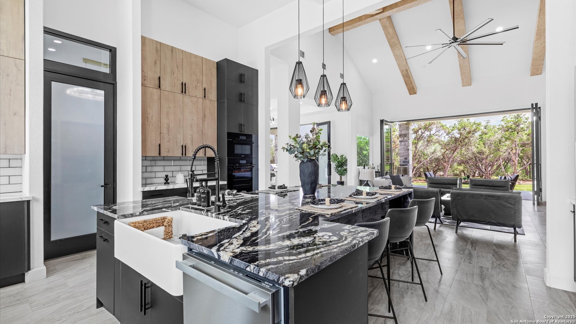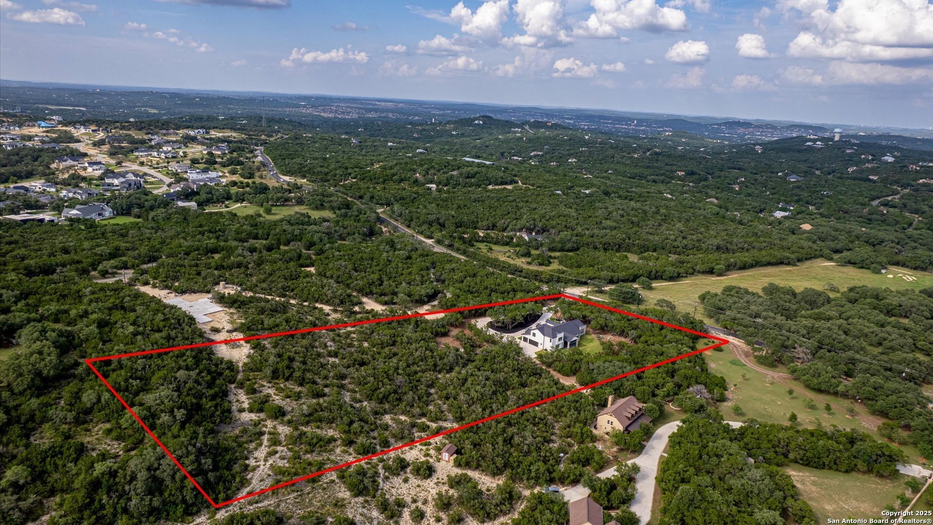 Property Description: Grand entry and chef's kitchen set the tone in this newly constructed architectural estate on 5 private acres along Scenic Loop-offering Hill Country privacy just minutes from premier shopping and dining. A circular drive leads to an oversized three-car side-entry garage. Custom 9-ft glass doors open to soaring interiors with 20-ft ceilings, exposed beams, cove lighting, and a dramatic floor-to-ceiling fireplace black tile fireplace with a floating staircase. The chef's kitchen features Miele luxury appliances, granite countertops, custom cabinetry, a large island, built-in 55-inch double-door refrigerator, ice maker, and commercial-grade six-burner gas cooktop. The private owner's retreat offers a spa-inspired bath with an oversized glass-enclosed shower and a generous walk-in closet with stackable washer/dryer. Expansive folding glass doors open to two covered patios and a custom outdoor kitchen, creating seamless indoor-outdoor living. A secondary bedroom with en-suite bath is on the main level. Upstairs includes a game room with bar, plus two additional bedrooms and a guest bath. Horses welcome. A rare opportunity for new construction on acreage in a prime location.