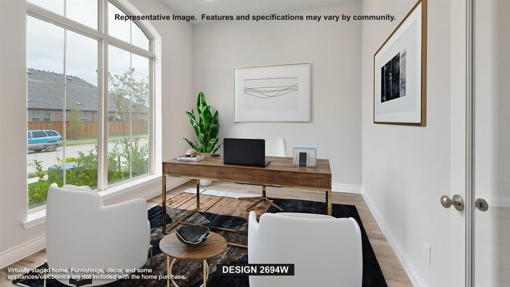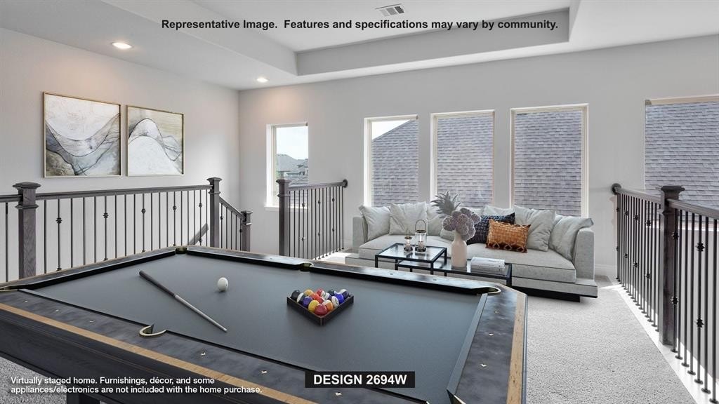 Property Description: Home office with French doors and 11-foot ceiling set at two-story entry. Open kitchen features deep walk-in pantry, a 5-burner gas cooktop, and generous island with built-in seating space. Dining area opens to two-story family room with wall of windows and a wood mantel fireplace. Primary suite includes bedroom with 10-foot tray ceiling. Double doors lead to primary bath with dual vanity, garden tub, separate glass-enclosed shower and large walk-in closet. An additional bedroom is downstairs. Secondary bedrooms and game room with 10-foot tray ceiling are upstairs. Covered backyard patio. Mud room off two-car garage.