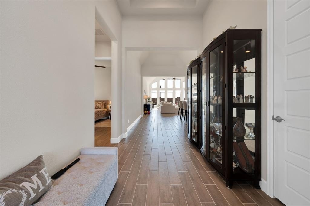 A spacious home office with French doors and large windows offers the perfect work-from-home space. A formal dining room area leads to the heart of the home a very large spacious family room with a wall of windows for natural light to enjoy. Large island kitchen features Butler's pantry and walk-in pantry. Game room with French doors off morning area. Master suite includes primary bathroom with dual vanity, freestanding tub, glass enclosed shower and two walk-in closets. Guest suite offers private bath. Timing is flexible with this seller-for this move in ready, upgraded generous one-story Perry built home! Take advantage of this unique floor plan! The living area showcases a true showstopper fireplace with a marble surround and dark oak mantle, blending modern elegance with timeless appeal. Light wood-look tile flows seamlessly throughout the home, complemented by custom roller shades on every window. All four bedrooms feature walk-in closets and ceiling fans for added comfort.