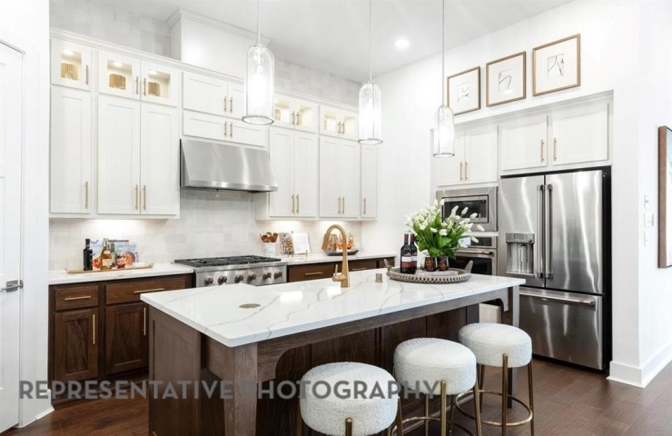 The Surrey is a thoughtfully designed floor plan that blends functionality and comfort, beginning with a welcoming entryway that leads you to two bedrooms, both complete with their own private baths followed by an additional bedroom with a bath nearby. Features a half bath for additional convenience. Continuing down the hall, you'll pass the study and a spacious entertainment room- perfect for gatherings. Adjacent is a modern kitchen with an island, seamlessly connected to a living room with a fireplace and dining area that opens onto a patio, ideal for indoor-outdoor living. The primary suite is privately situated at the back, featuring an ensuite bathroom with a freestanding tub and ample closet space. A two-car garage offers additional storage and convenience. Enjoy access to Landmark by Hillwood’s resort-style amenities, trails, and prime Denton location with easy access to shopping, dining, and major highways.