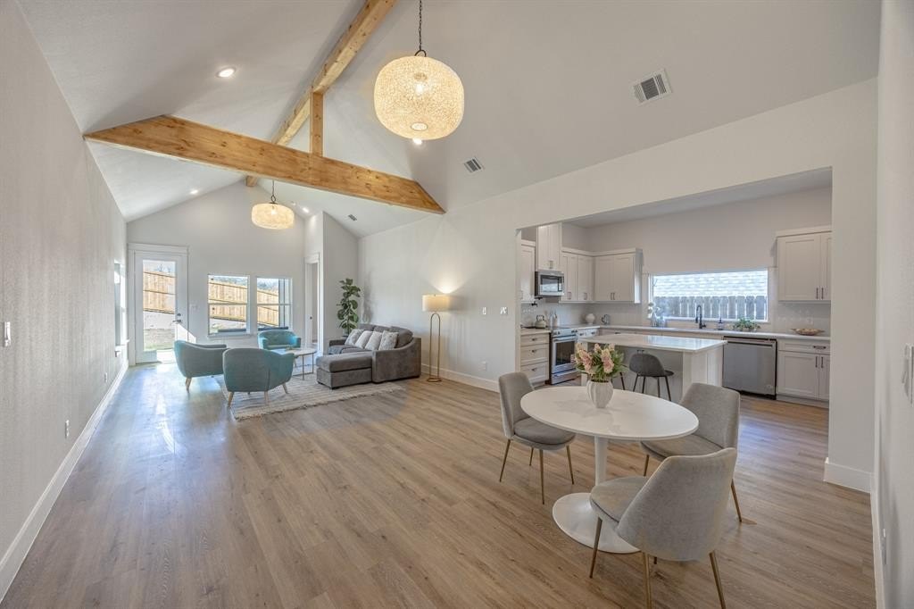 Property Description: Stunning 2026 New construction modern farmhouse 4 bedroom, 3 full bathrooms featuring designer finishes, an open concept layout, and exceptional craftsmanship throughout. The striking exterior showcases dark board and batten siding with brick accents, creating a bold yet timeless curb appeal. Step inside to a welcoming foyer with high ceilings and abundant natural light that leads into a spacious living area highlighted by vaulted ceilings and exposed wood beams, creating a warm and elegant atmosphere. The open floor plan seamlessly connects the living room, dining area, and kitchen perfect for both everyday living and entertaining. The chef inspired kitchen offers quartz countertops, a large island with seating, custom cabinetry, stainless steel appliances, and ample storage space. Thoughtfully designed finishes and modern fixtures elevate the space while maintaining a comfortable and functional layout. The primary suite serves as a private retreat with a spa style bathroom featuring dual vanities, a large walk in shower with designer tile, glass enclosure, and modern black fixtures. Secondary bedrooms are spacious and versatile for guests, family, or a home office. Additional highlights include luxury vinyl plank flooring, modern lighting, and an attached garage. The home also features a private backyard, ideal for relaxing or entertaining outdoors. Conveniently located near downtown Fort Worth, major highways, dining, and shopping, this home offers both modern style and everyday convenience. Move in ready and built with quality craftsmanship schedule your showing today.