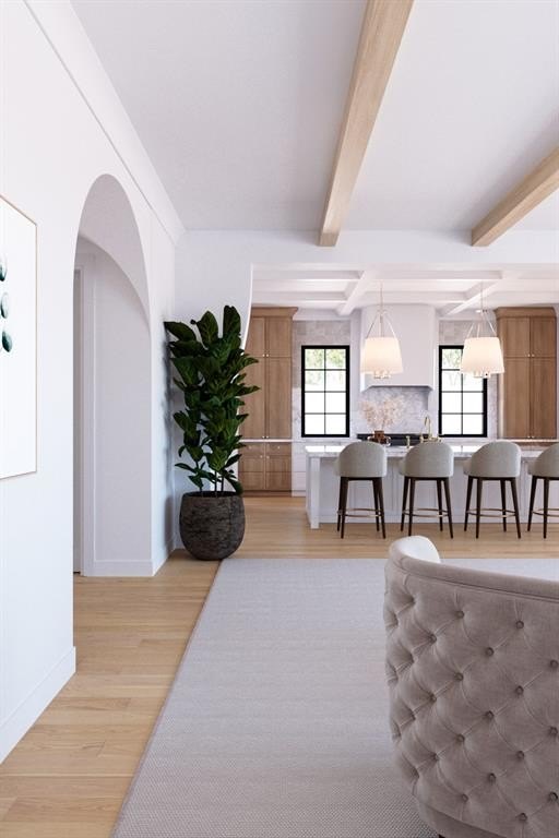 Light-filled interiors showcase soaring ceilings, clean architectural lines, and warm natural textures that create an inviting yet sophisticated atmosphere throughout. Expansive living areas flow seamlessly into a beautifully appointed chef’s kitchen featuring custom cabinetry, premium appliances, designer lighting, and a generous island designed for gathering.