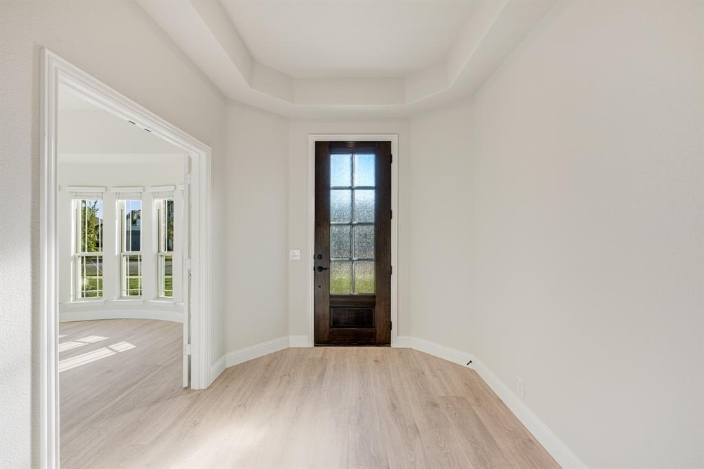 Property Description: NEW! NEVER LIVED IN. Ready NOW! Pull up to find a charming brick and stone façade complemented by an elegant 8' front door, setting the stage for this stunning home nestled in a quiet part of the community. Inside, the open-concept design boasts 4 bedrooms, 3 baths, and a Study with bright, beautiful bay windows, and Glass French Doors. The expansive Family Room is enhanced by a striking Stone-to-Ceiling Fireplace with a cedar mantel, while durable LVP flooring flows throughout all first-floor main areas for both style and easy maintenance. The Kitchen is a true centerpiece, showcasing exotic Quartz countertops, sleek all-electric stainless steel appliances, a maze mosaic backsplash, painted shaker-style cabinets in gauntlet grey, and ample storage with pot and pan drawers below the cooktop. A custom wood vent hood adds charm and functionality, while the large island, spacious walk-in pantry, and buffet at the Breakfast Nook provide additional convenience. The luxurious Primary Suite offers a serene retreat with a seating area, walk-in closet, shower, and a garden tub, while charming window seat enhance the cozy ambiance. Upstairs, a versatile Game Room and Guest Suite complete the thoughtful layout. This beautifully designed home on an interior lot is a perfect blend of style, comfort, and functionality—contact Bloomfield at Coyote Crossing today!