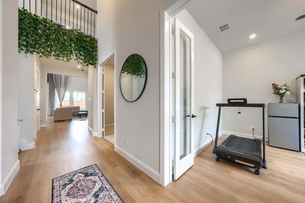 Extended covered patio, featuring upgraded decorative flooring—the perfect spot for Texas sunsets. Even the 3-car tandem garage has been elevated with high-end epoxy flooring, overhead storage racks, and a custom slat wall system for the ultimate organized workspace.